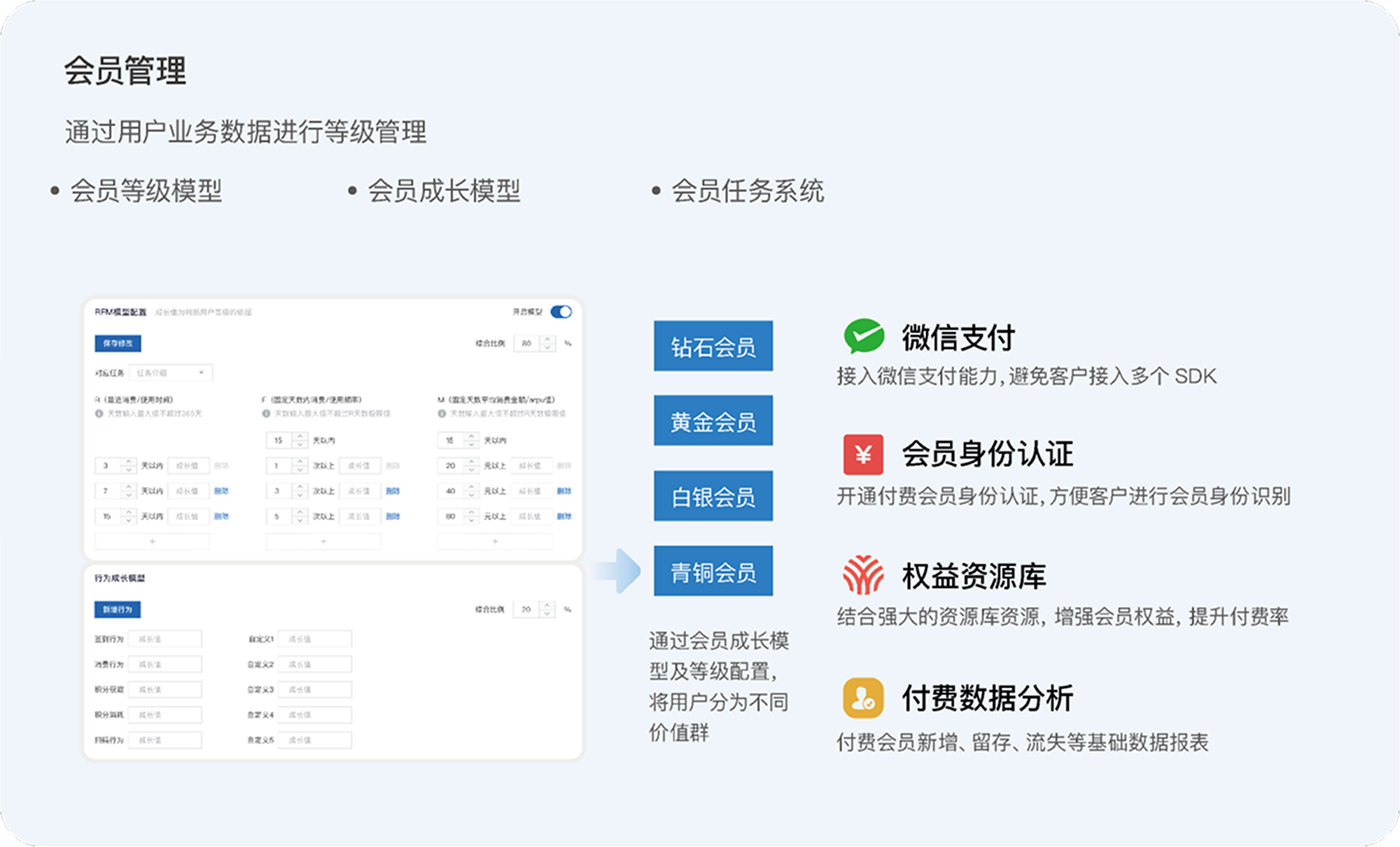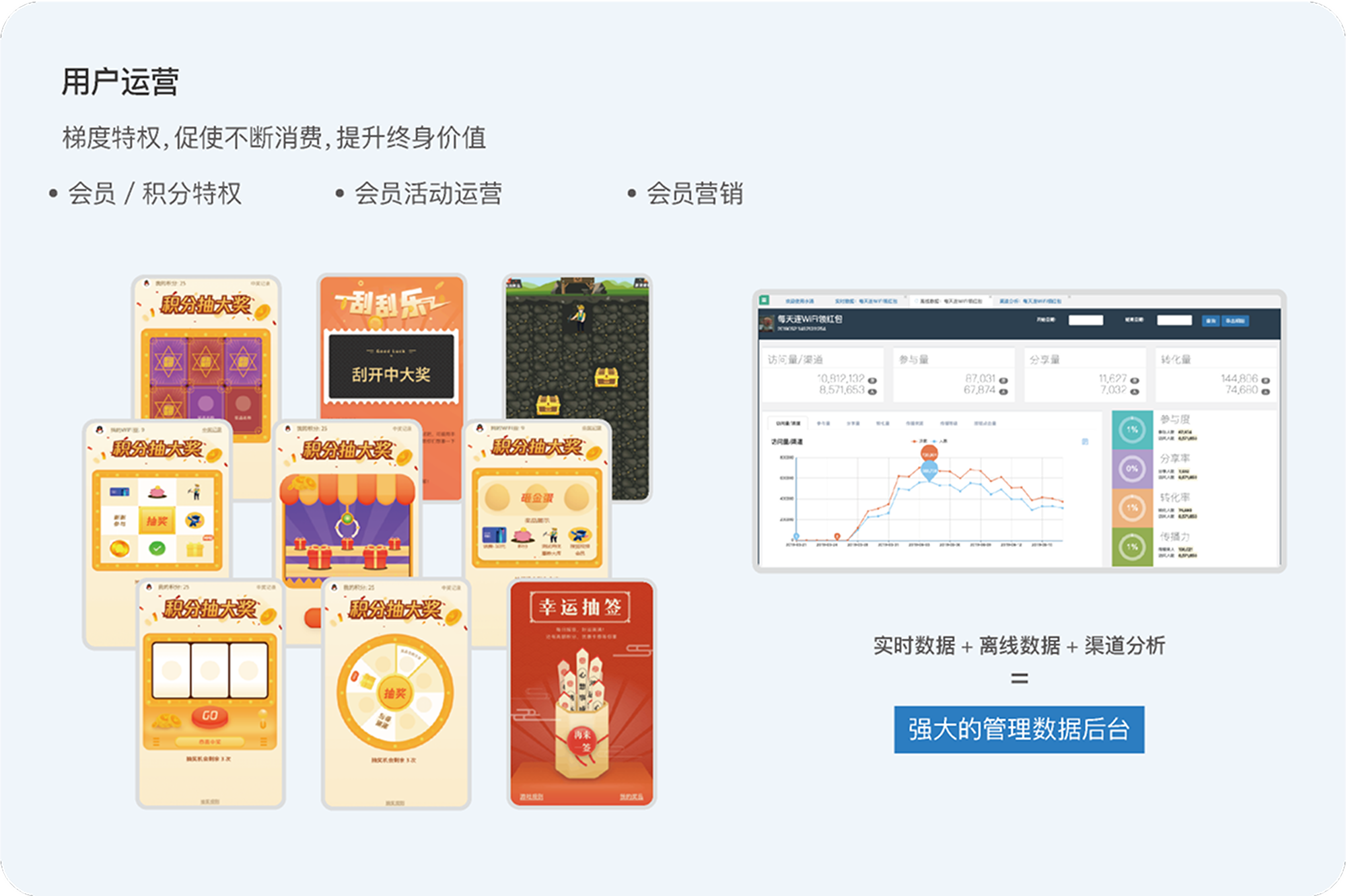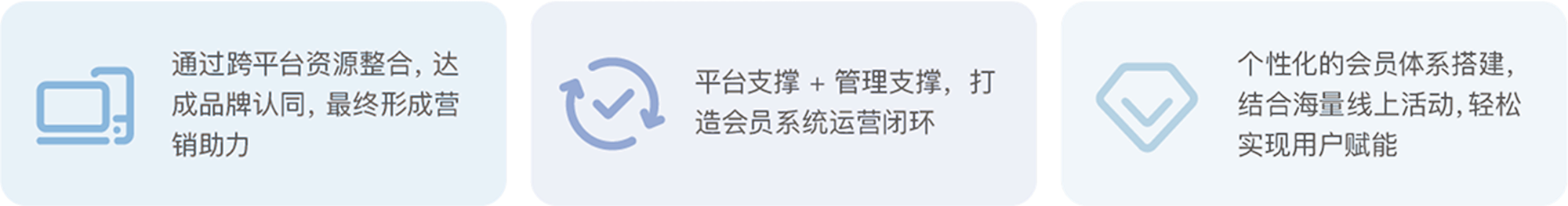 一站式会员管理体系平台支撑 + 管理支撑 助力房企沉淀客户资产,打造会员体系运营闭环。